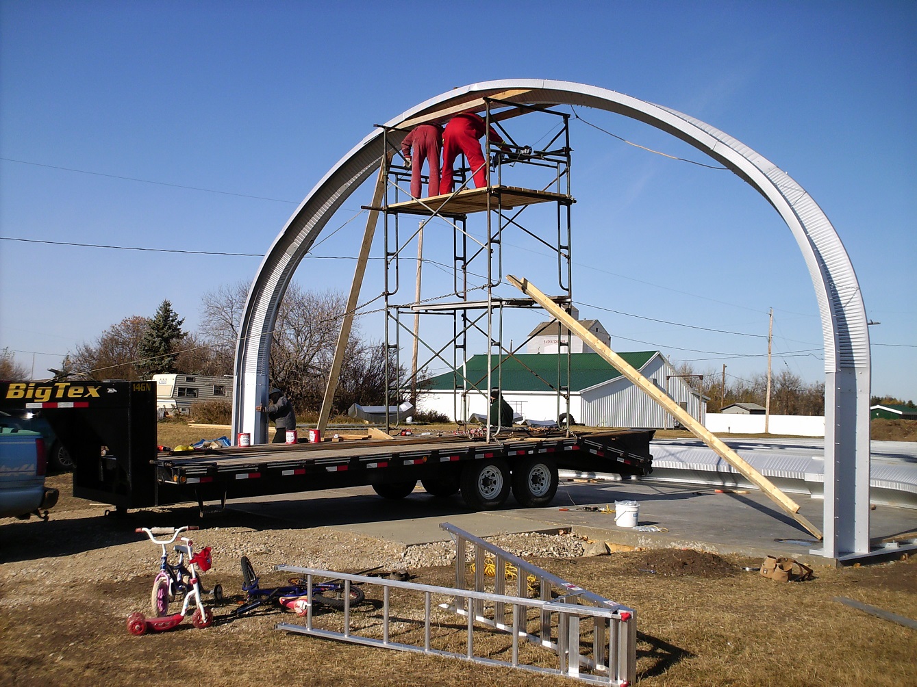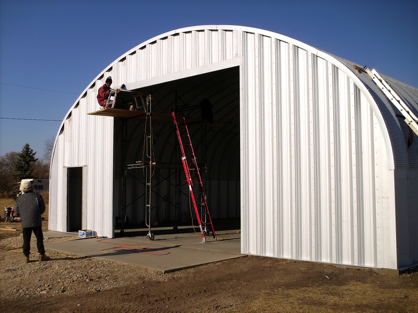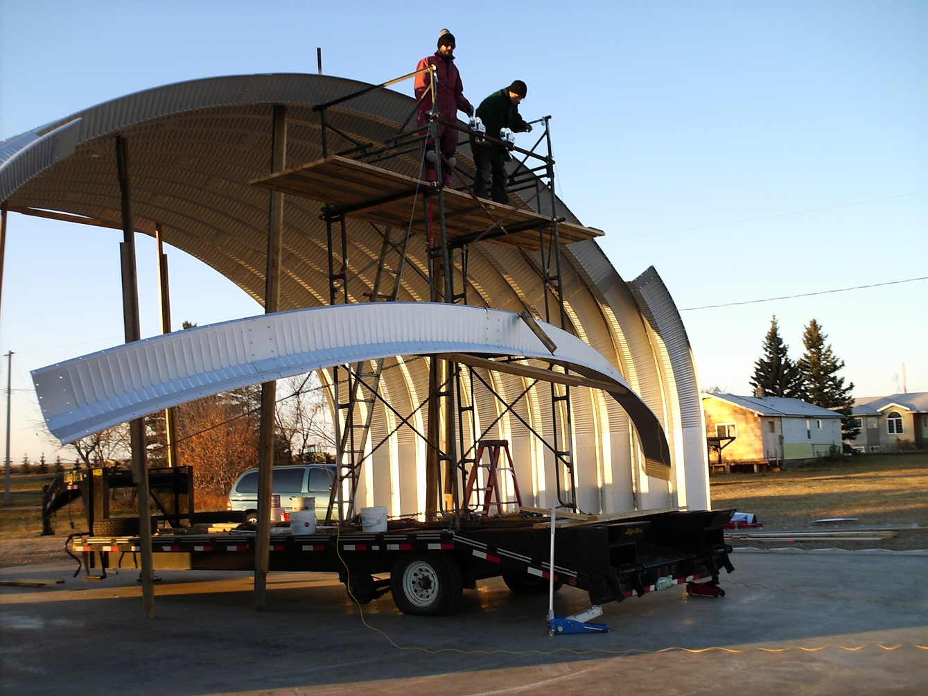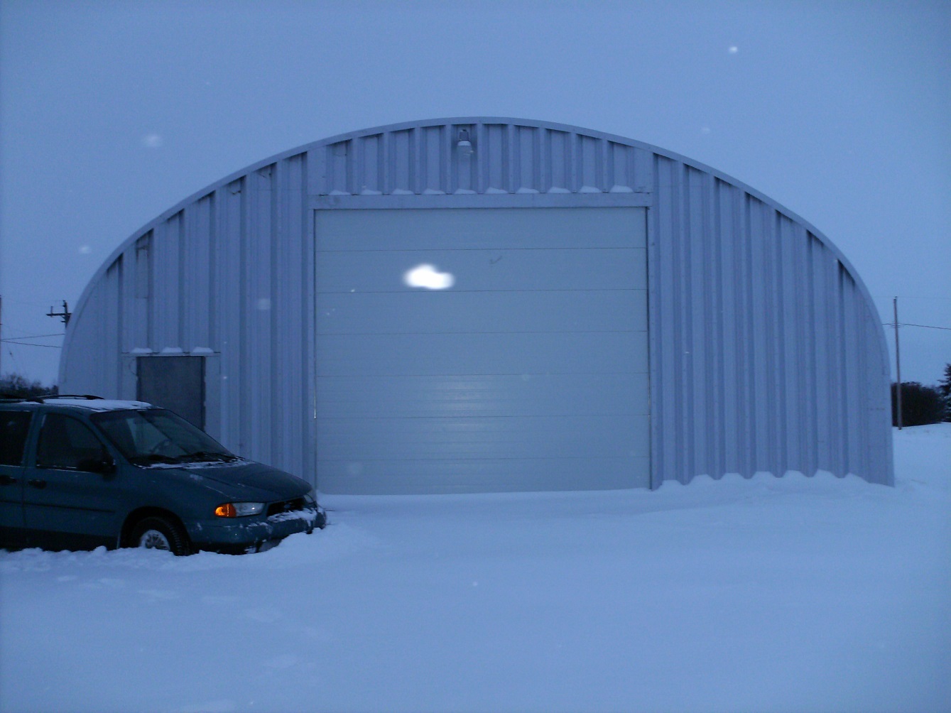 Through Vince, we were asked to erect a steel quonset in the town of Baldwinton, Saskatchewan. This was our first major challenge since Robert's accident. In fact, it was such a challenge, twice we almost gave up. But somehow, by God's leading, we were given to succeed. we were not able to install the over-head door until January where the temperature was dipping into the "ouch" zone. |